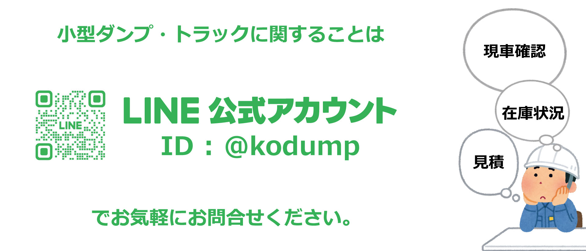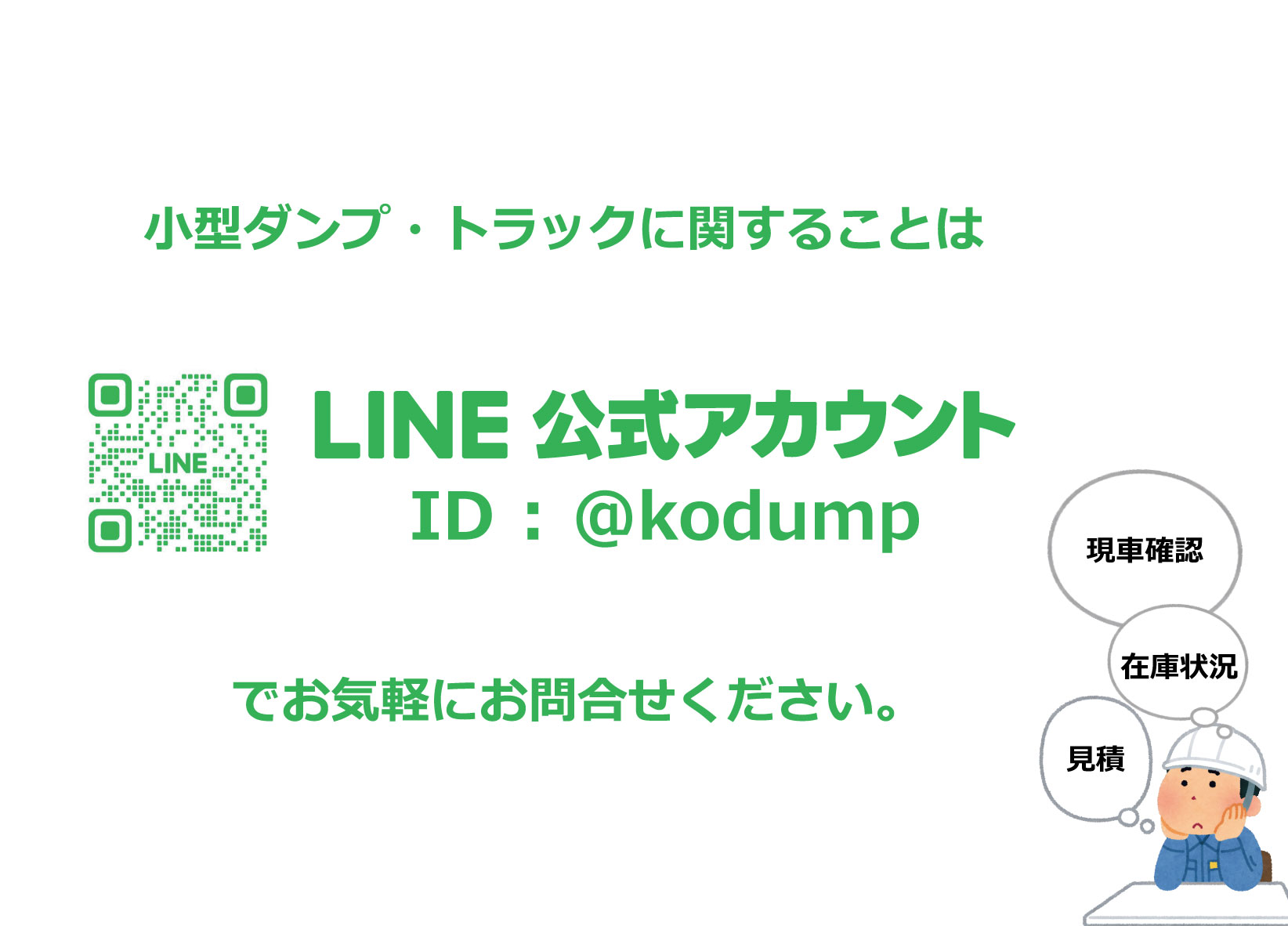 ダンプのご購入に関するご質問や、在庫車両の詳細、納車スケジュールなど、 気になることがございましたらお気軽にお問い合わせください。 販売に付随する鈑金・塗装・架装・修理・車検(予備検査)などの対応についてのお問い合わせは、 公式ホームページのお問い合わせフォームより承っております。ご連絡を心よりお待ちしております。